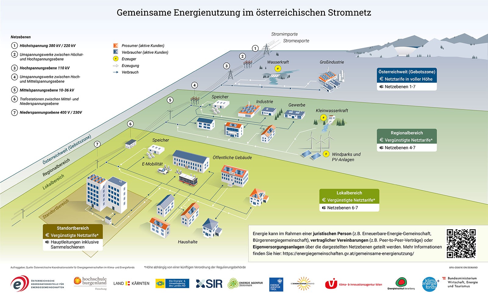 Wird Strom ausschließlich im Lokalbereich (über ein Niederspannungs-Verteilernetz und den Niederspannungsteil der Transformatorstation) oder im Regionalbereich (über das Mittelspannungsnetz und alle ohne Umspannung miteinander verschaltbaren Mittelspannungs-Sammelschienen im Umspannwerk) gemeinsam genutzt, fallen reduzierte Netzentgelte für den verbrauchten Strom an. Die Höhe dieser Vergünstigungen ist noch abhängig von einer künftigen Verordnung der Regulierungsbehörde.